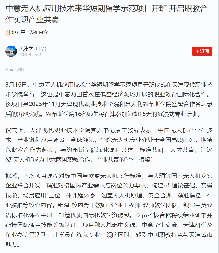 3月16日,中意無人機應(yīng)用技術(shù)來華短期留學示范項目開班儀式在天津現(xiàn)代職業(yè)技術(shù)…